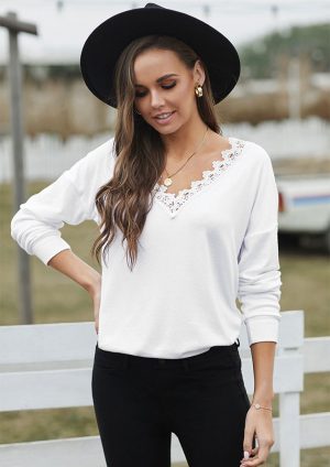 Diana Eyelash Lace Trim Long Sleeve Top WHITE